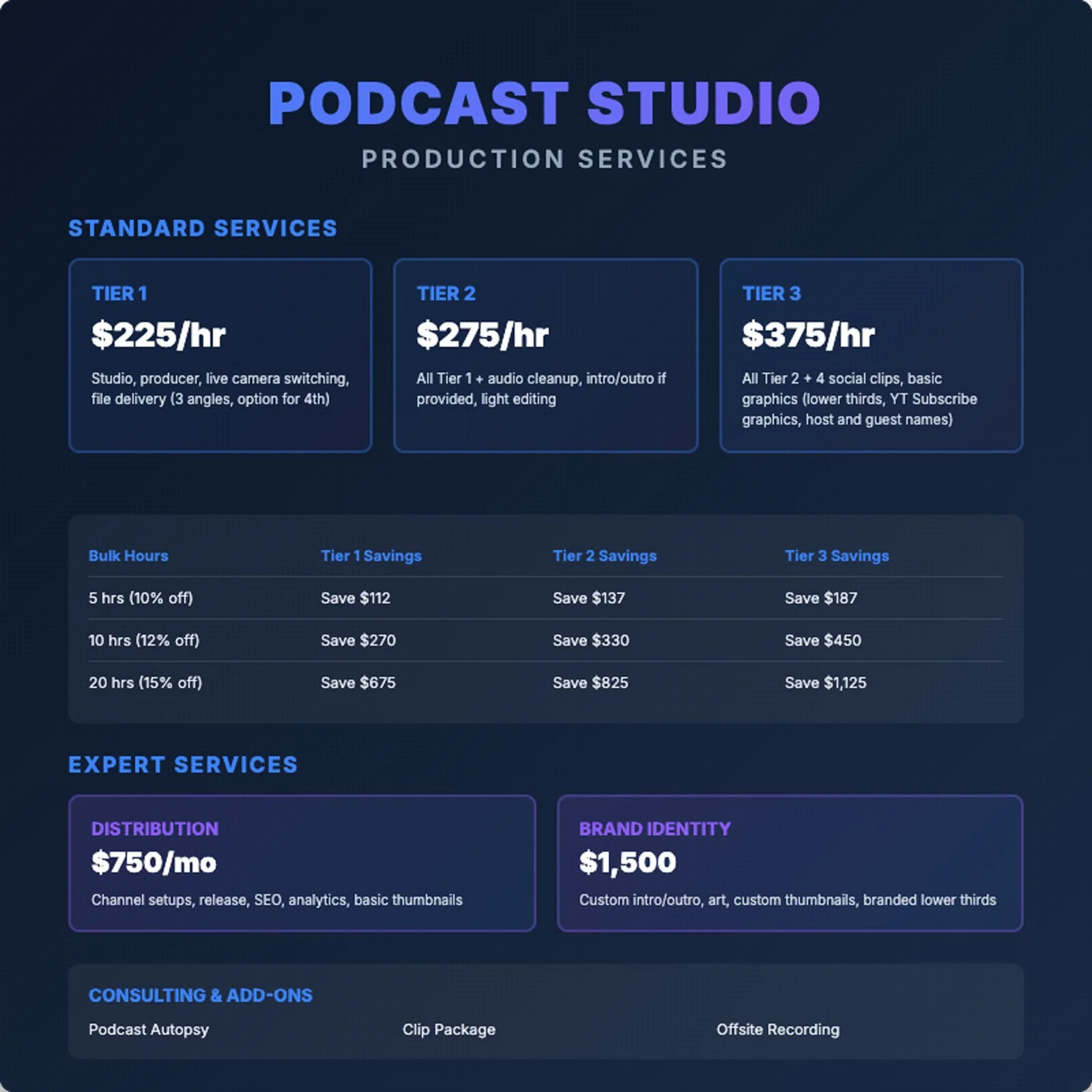 Creative work pricing can vary wildly depending who you talk to. After years of doing podcasts for clients, we developed what we believe to be a very fair scale of cost that depends entirely on how much sweat equity you need from us, versus what time and energy you are willing to put into your show!